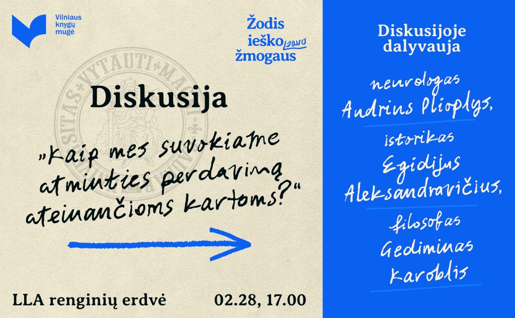 Vasario 28 d., 17.00 val. LLA renginių erdvėje kviečiame į diskusiją „Kaip mes suvokiame atminties perdavimą ateinančioms kartoms?“ Literatūrologė Aurelija Mykolaitytė kalbins neurologą Audrių Plioplį, istoriką Egidijų Aleksandravičių, filosofą Gediminą Karoblį.